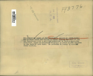 Shown is the Prince of Wales opening the door of the new department with a gold key presented by Mr. W.D. Caroe, the architect. Later he witnessed displays by about 10,000 children in the Cardiff Arms Park. He returned to London by air.