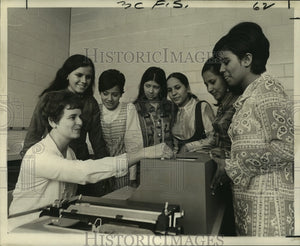 Six youngsters, all exchange students from Guayaguil, Ecuador, watch as Mrs. Lucy Rushing, a data processing teacher, explains the complicated system to them. Standing, from left, the girls are: Manuela Pareja, Elizabeth Jimenez, Margarita Hinojosa, Pamela Chong-Qui, Mariana Arias and Patricia Macias.