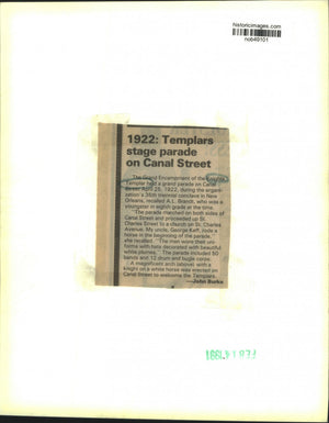 The Grand Encampment of the Knights Templar held a grand parade on Canal Street April 25, 1922, during the organization's 35th triennial conclave in New Orleans, recalled A. L. Brandt, who was a youngster in eighth grade at the time. "The parade marched on both sides of Canal Street and proceeded up St. Charles Street to a church on St. Charles Avenue. My uncle, George Keff, rode a horse at the beginning of the parade," she recalled. "The men wore their uniforms with hats decorated with beautiful white plumes." The parade included 50 bands and 12 drum and bugle corps. A magnificent arch with a knight on a white horse was erected on Canal Street to welcome the Templars.