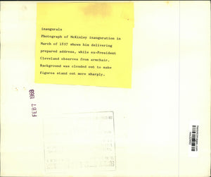 Photograph of McKinley inauguration in March of 1897 shows him delivering prepared address, while ex-President Cleveland observes from armchair. Background was clouded out to make figures stand out more sharply.