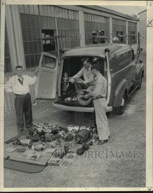 A portion of the panel truck's myriad contents is shown by (from left) William Zeringue, New Orleans Fire Department supervisor of maintenance; mechanic George W. Gazin; assistant supervisor Arthur Perrot.