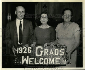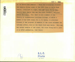 At '26 Amite High Reunion - These New Orleanians attended the reunion Friday night of the 1926 class at Amite High School. From left to right, they are Jules Wesit, Mrs. Carroll Buck, Amite (who was the class teacher), and Miss Stella Whittaker. Mrs. Buck is now a member of the faculty at Southeastern Louisiana College, of which a member of her 1926 class, Doctor L. H. Dyson, is president Sixteen of the original 32 members of the class attended the informal affair, held at the Skeet Club near Amite. This was the second reunion of the class, the first being held a year or so after graduation.