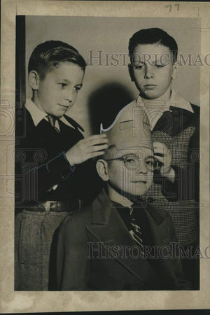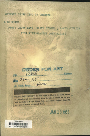 Mardi Gras, New Orleans, Carnival - Young John Massey, 12, will reign as king of the Elks Krewe of Orleanians at Carnival-time. Here he tries a crown on for size with the help of Ralph Stroup, left, and James Jordan, right. All boys are of Burton Memorial Home. Orphans Crown King of Orphans.