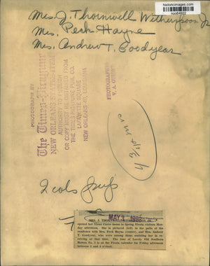 Mrs. J. Thornwell Witherspoon Jr. opened her Vieux Carre home to Spring Fiesta visitors Monday afternoon. She is pictured (left) in the patio of the residence with Mrs. Peck Hayne (center) , and Mrs. Andrew T.. Goodyear, who were among those assisting her in receiving at that time. The tour of Lovely Old Southern Homes Number 2 is on the Fiesta calendar for Friday afternoon between 2 and 5 oE™clock.