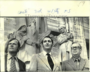 Standing on the steps of the Louisiana Capitol in Baton Rouge Thursday preparing for the opening of the constitutional convention Friday were delegates (from left) Autley Newton, Hammond; House Speaker E.L. "Bubba" Henry, Jonesboro and Stte Representative Robert J. Munson, Cheneyville. Overlooking them is a statute of the firs Louisiana settlers. Henry believes he has enough votes to be elected convention chairman.