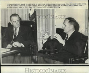 Welfare Secretary John Gardner talks today with President Johnson in the Cabinet Room at the White House to deliver a first-hand report on his recent trip to Vietnam.