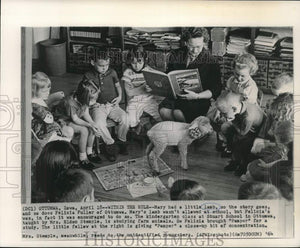 Mary had a little lamb, so the story goes, and so does Felicia Fuller of Ottumwa. Mary's lamb wasn't allowed at school, but Felicia's was, in fact it was encouraged to do so. The kindergarten class at Stuart School in Ottumwa, taught by Mrs. Eldon Stemple, is studying farm animals. So Felicia brought "Pamper" for a study. The little fellow at the right is giving "Pamper" a close-up bit of concentration. Mrs. Stemple, meanwhile, reads to the unidentified youngsters.