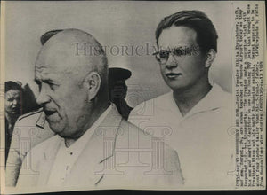Soviet Premier Nikita Khrushchev, left, and son, Sergei, 24, are shown together at Moscow Airport today as they inspected U.S. jet transports. The Premier made a surprise visit with his son and married daughter to see the Boeing 707 jets that brought Vice President Nixon and his party to Russian capital. Sergei appears tobe about four inches taller than his 5-foot-5 father.