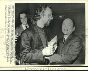 The ReverendPaul Mayer, an antiwar leader now teaching at the New York Theological Seminary, and Hoang Quoc Viet, head of the North Vietnamese delegation, smile at the Friday opening of the World Assembly of Paris for Peace and Independence of Indochinese Peoples. The assembly opened with sharp protests of the U.S. move to interrupt the Paris Peace Talks on Vietnam.