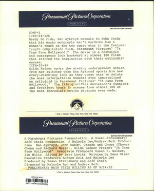 Ready to ride, Dan Aykroyd reveals to John Candy that his macho motorcycle man's wardrobe has a woman's touch as the two guest star in the feature-length compilation film, Paramount Pictures' "It Came from Hollywood." The movie is a nostalgic and outrageous look backward at almost 100 films that stirred the imagination with their outlandish scenes. Gilda Radner spots the missing undergarment stolen from her suitcase when Dan Aykroyd sports his new every-which-way look as they guest star to salute the most unforgettable moments ever immortalized on celluloid in Paramount Pictures' "It Came from Hollywood." The film glorifies movieland's funniest and freakiest hours in scenes from almost 100 of the most incredible motion pictures ever made.