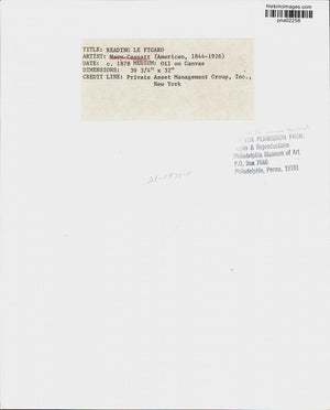 Title: "Reading Le Figaro"; Artist: Mary Cassatt (American, 1844-1926); Date: c. 1878; Medium: Oil on Canvas; Dimensions: 39 3/4"x32"; Credit Line: Private Asset Management Group, Incorporated, New York.