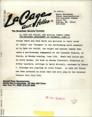 George Hearn and Gene Barry are pictured in their roles of "Albin" and "Georges" in the forthcoming premieres of "La Cage Aux Folles"