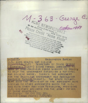 Secretary of State George Marshall signs a formal agreement to send army-navy-air force mission to help Brazilian Government establish a national college there. Also shown Ambassador Mauricio Nabuco.