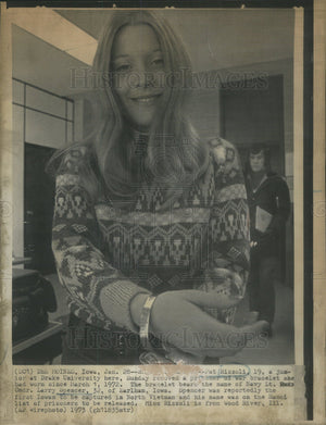 Pat Rizzoli, junior at Drake University removed a prisoner of war bracelet she had worn which bears the name of her boyfriend Navy Lt. Cmdr. Larry Spencer, who was captured in North Vietnam.