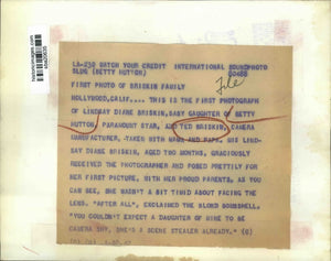 This is the first photo of Lindsay Diane Briskin, baby daughter of Betty Hutton, Paramount Star, and Ted Briskin, camera manufacturer, taken with Mama and Papa. Miss Lindsay Diane Briskin, aged two months, posed prettily for her first picture, with her proud parents. she wasn't a bit timid after facing the lens. "After All", exclaimed the blond bombshell, "You couldn't expect a daughter of mine to be camera shy, she's a scene stealer already."