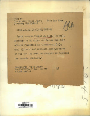 Fleet Admiral Ernest J King (aboce) gestures as he tells the Senate Military Affairs Committee in Washington, DC, Oct 23, that the proposed consolidation of the war and navy departments is "working the problem backward."