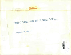 Cornelius Melyn purchasing Staten Island from the Indians in 1630. Melyn's settlement was destroyed, however, in a skirmish with the Indians. Mural by Fred C. Stahr in 1935.