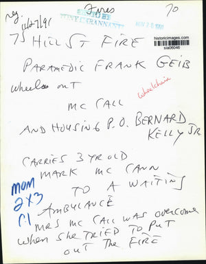 Fires. 75 Hill Street fire. Paramedic Frank Geib wheelchairs McCall and Housing Police Officer Bernard Kelly Jr. carries 3 year old Mark McCann to a waiting ambulance. Mrs. McCall was overcome when she tried to put out the fire.