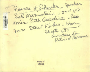 New York - Pearce H. Shanks, speaker; Sol Marinstein, 2nd vice president; Miss Ruth Gardiner, secretary; Mrs. Ethel Kober, president, Chapter 437, American Association of Retired Persons